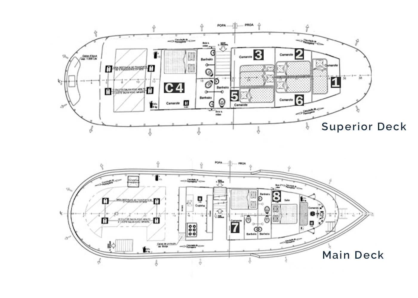 There are 3 matrimonial suite cabins equipped with a double bed and a private bathroom. Cabins also have a fan, a mirror and, a basketed shelving unit for clothing. All cabins have portrait windows and Air conditioning. Cabins #3, #7 and #8, only #3 is available for triple accommodation with an additional bunk-bed.