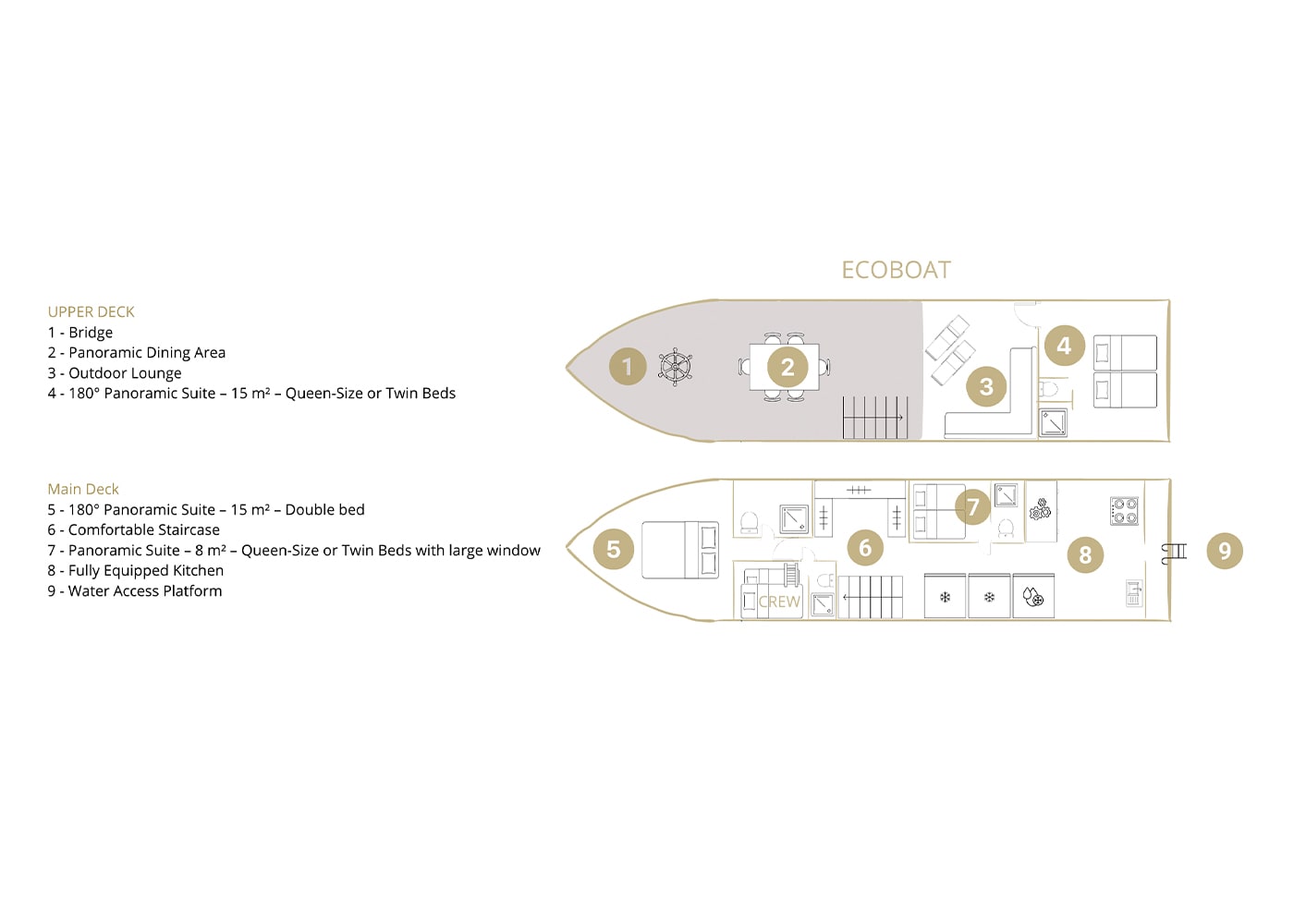 This suite is located on the main deck and it offers either a queen-size bed or two single beds, ideal for couples, families, or friends. It features an en-suite bathroom offering breathtaking views. A panoramic safety window, cupboard storage, individually adjustable climate control and high-quality linens provide both style and practicality. Consequently, guests enjoy eco-conscious travel without sacrificing elegance.