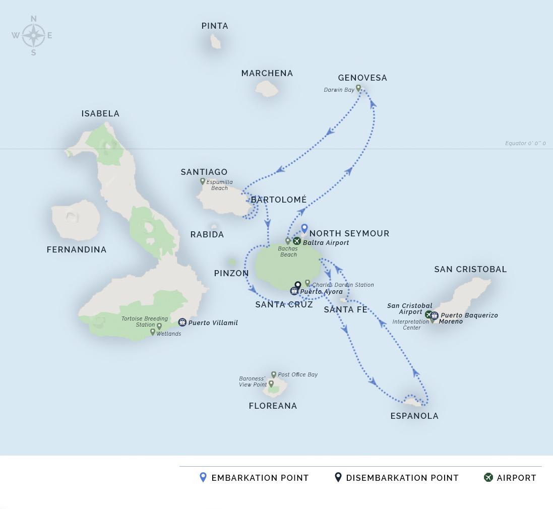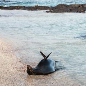 AM: For those who missed the equatorial crossing the night before, ask our crew for your very own equator crossing certificate -although this is usually reserved for our young explorers, even the young at heart will proudly be able to take this home! This morning we disembark on the black sand beaches of Puerto Egas, northwest of Santiago Island. Once the location of a salt mine (1967), today you can take a two and a half-hour hike to find the abandoned mine turned into a shallow saltwater lake. For those who prefer to stay by the beach, you will be able to walk the intertidal zone to the fur seal grottos or snorkel to watch sea turtles, sea lions, and white-tipped sharks.