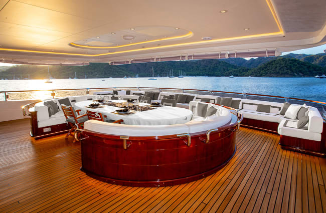 Outside of your cabins, the onboard social spaces are equally inviting, not least the panoramic main lounge, distinguished by its beam-to-beam windows, a huge U-shaped sofa, and two large flatscreen televisions. The teakwood sun deck has outdoor seating with a wraparound lounge sofa, a six-person jacuzzi, and convertible workout zones. Big TV screens are positioned on either side of the jacuzzi. The vessel also features a Beach Club, located at water level on the lower deck, which incorporates a swimming platform from which many excursions are launched; it has a wraparound sofa, picture windows, and a flatscreen TV.