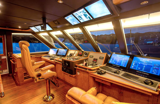 Located on the Bridge Deck, this suite complete with double bed is located on the highest level of the yacht. The cozy and complete small bathroom suits all needs. Ample closet space is sufficient to unpack fully for your seven nights onboard. It even comes with a leather-clad writing desk and comfortable bamboo writing chair. A great room with plenty of natural light and wonderful private view from the large panoramic window.