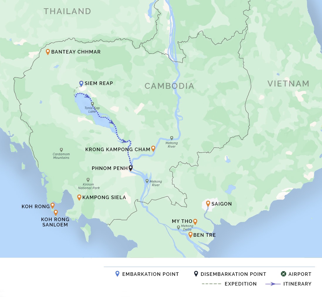 Siem Reap Extension: During low water season, cruise vessels are not able to travel up to the Tonle Sap Lake due to the water level. Airplane transfers via Cambodian Angkor Air are included in your cruise fare in order to continue your Cambodian adventure with us to Siem Reap and its ancient lost city of Angkor Wat. Requests for flight changes and/or upgrades are not available. Please kindly inform our Reservations team should you choose to remain in Phnom Penh after disembarkation.