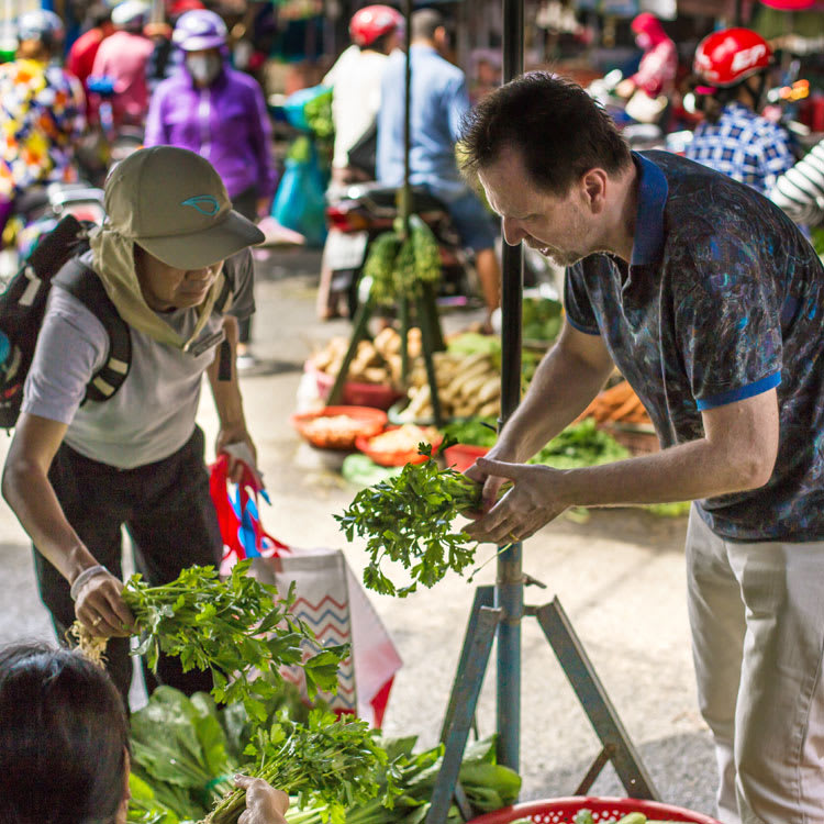AM: Say ‘Good Morning, Vietnam’ while we cross the border and sail towards Tan Chau, a vibrant border town where we take the local rickshaw called "xe loi" for a trip around town or pedal 18 kilometers on the peaceful island of Long Khanh.
