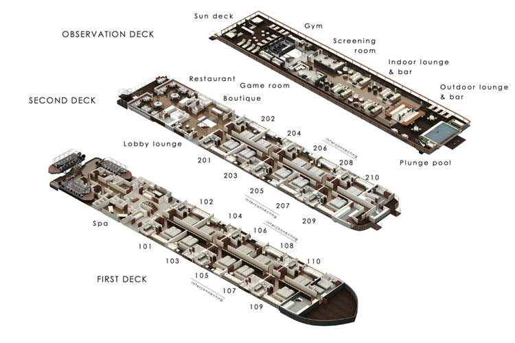 These spacious and air conditioned rooms are designed for discerning guests. The private ensuite facilities come with a professional hairdryer, all organic natural hair and bath amenities, and a walk-in shower. Families and guests traveling in bigger groups can benefit from the 4 sets of interconnected cabins on this deck. Passengers may select a pair with one suite configured as a private living room, and the other a master bedroom.