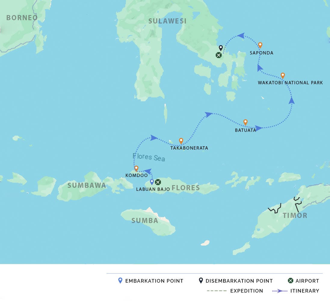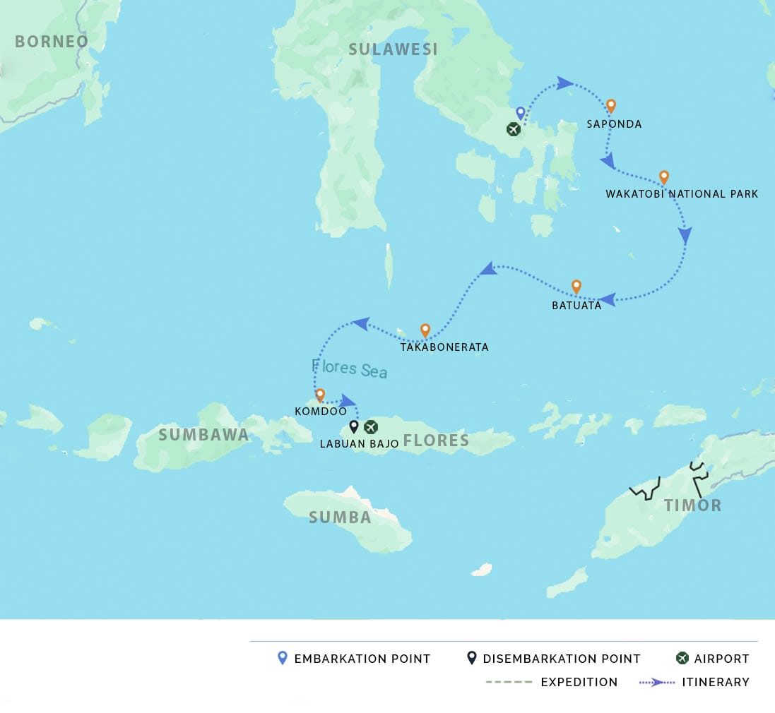 AM: We will arrive at the harbor of Kendari in the early morning. After breakfast, we will say farewell to the crew and be transferred to the airport for the guests' departure.