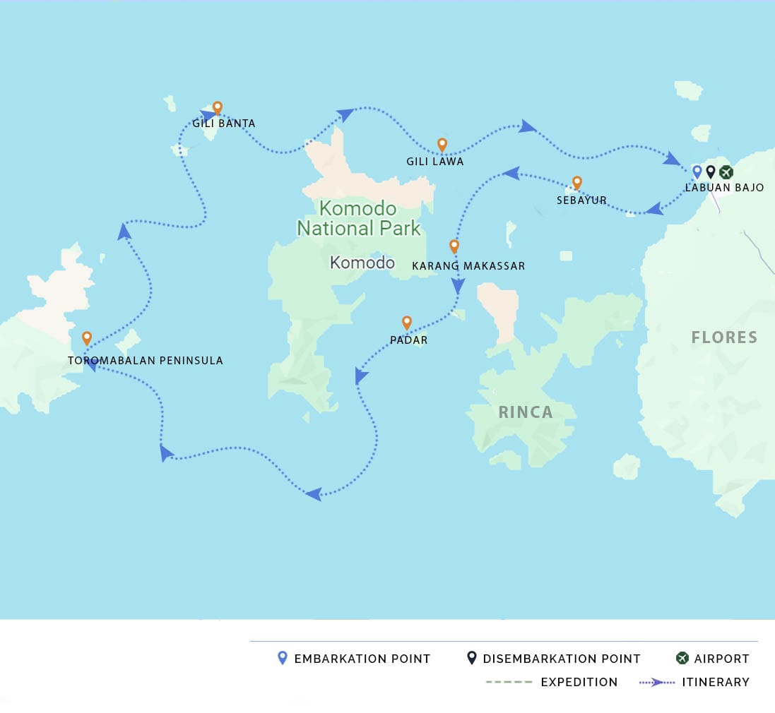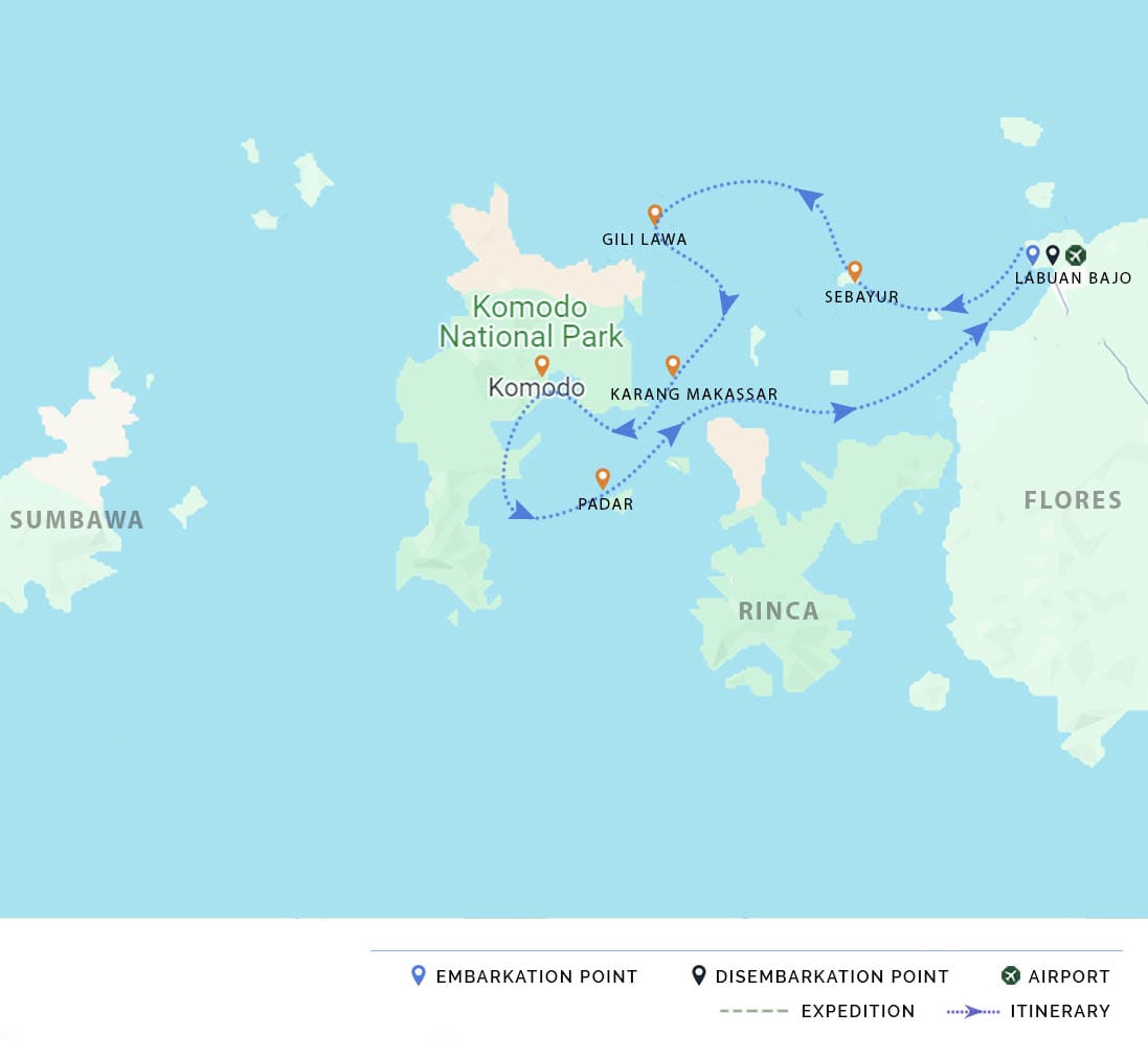 AM & PM: Upon arrival at Labuan Bajo Airport, we will transfer to the harbor, where we board our vessel. We will sail for one hour while your cruise director provides a general briefing to familiarize you with the vessel and our safety procedures. We will then enjoy a swim along the beautiful beach of Kelor Island before trekking through the monsoon forests of Rinca Island, hoping to catch a glimpse of the elusive Komodo dragon.