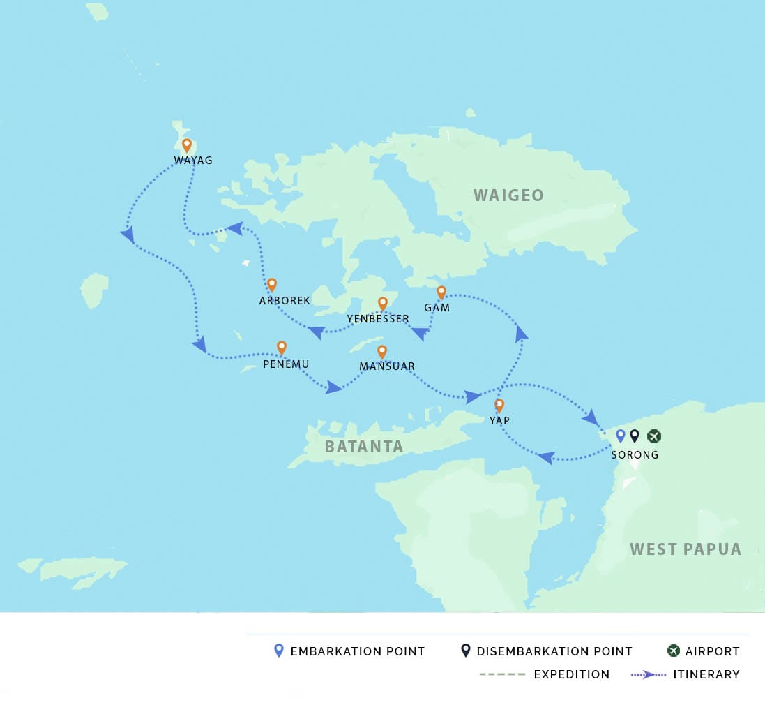 AM: Upon arrival at Sorong Airport, we will immediately transfer you to the harbor, where vessel awaits. Once aboard, our Cruise Director will provide a general briefing to familiarize you with the vessel and our safety procedures. We will then raise the anchor and set sail for Yap Island, the first of the Four Kings, where you can enjoy your first snorkeling experience in its pristine underwater world and along its stunning white sand beaches.