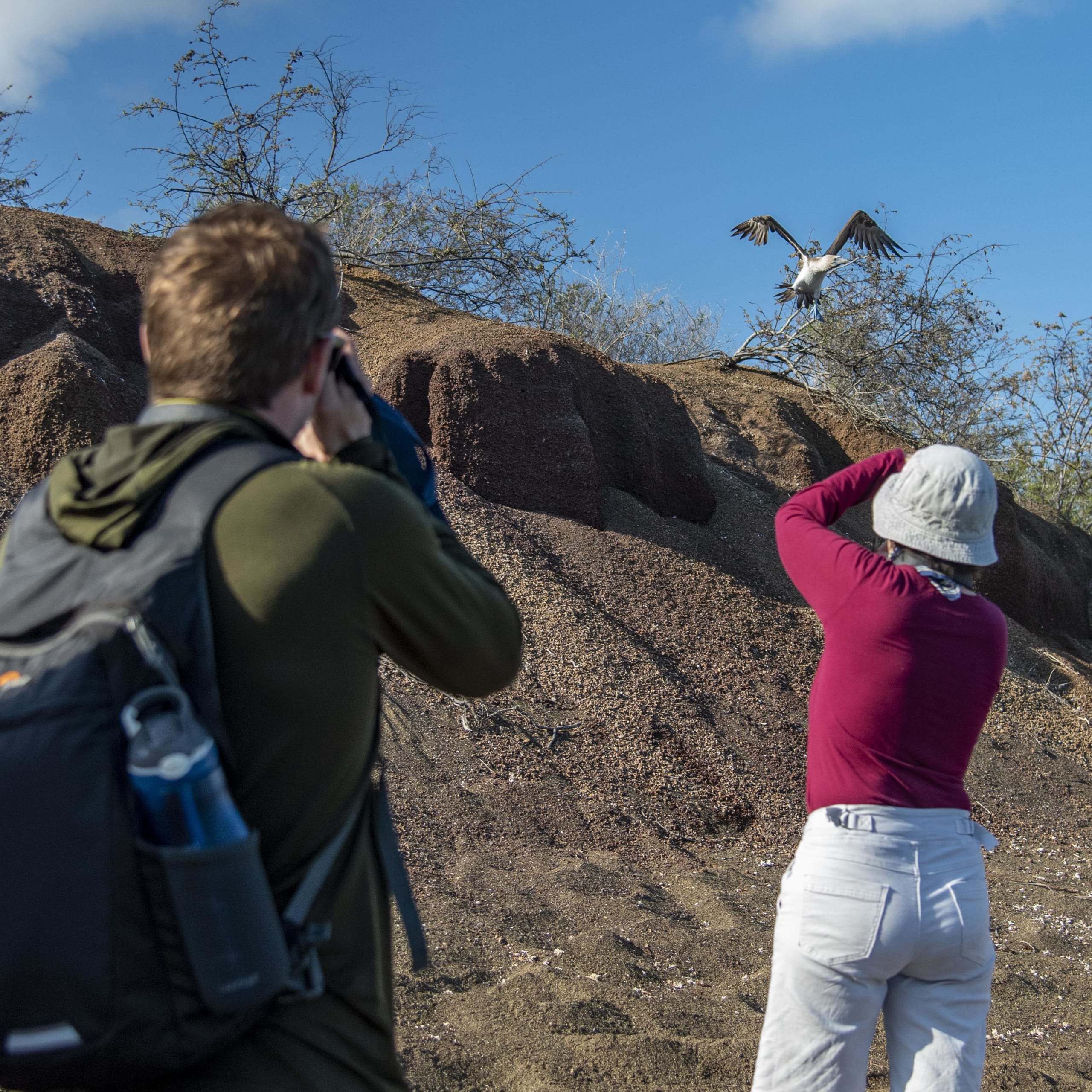 AM: This island is home to large colonies of both magnificent and great frigatebirds and you can see them displaying their red balloons to attract a female. Blue-footed boobies nest in the ground and perform their famous dance in the open areas, while swallow-tailed gulls perch on the cliff edges. Land iguanas are common inland while their marine cousins bask in the rocks by the sea, close to sea lions, which often like to body surf in the waves.