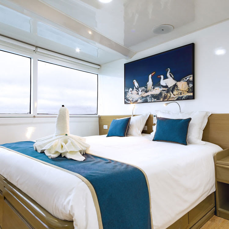 The 115-foot Calipso features eight generously-sized and plentiful social spaces, all decorated in classic navy and white yacht style. A trip to the Galapagos Islands is all about fun in the sun, so you will immediately be drawn to the sundeck. Take a dip in the Jacuzzi, have a drink and a snack at the BBQ bar, or relax in a lounge chair and just soak in the moment. When it is time to retreat indoors, the main deck bar and lounge are the perfect spots to relax after a day of adventures. The lounge is even stocked with a DVD collection for a movie night at sea.