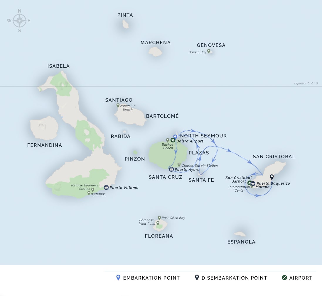 PM: Dry landing in Puerto Baquerizo Moreno, the capital of the Galapagos Islands. Passengers visit the Interpretation Center, an excellent place to learn about the islands’ history in the Museum of Natural History which displays information about the volcanic origins of the islands, their remoteness from the continent, ocean currents, climate, and the arrival of the different species. The human history is also showcased, chronologically narrating the most significant events related to the discovery and the island’s colonization.