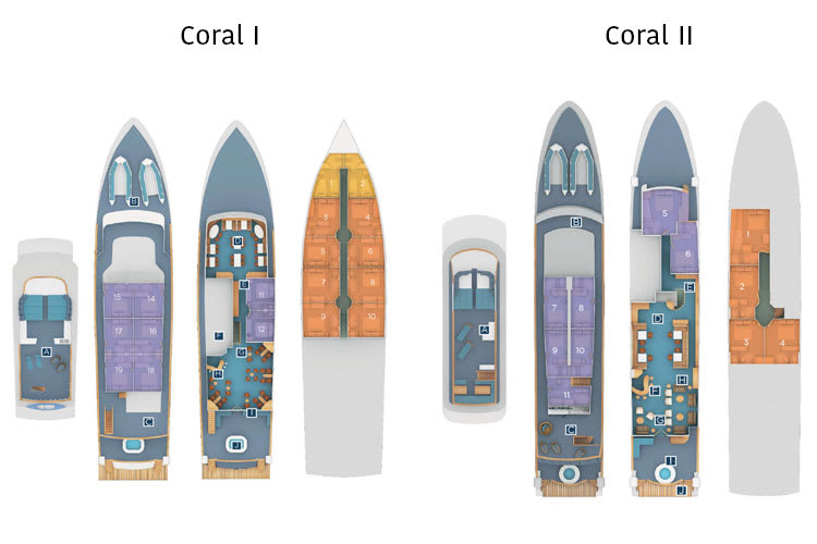 As one of 36 guests on the Coral I or 20 on the Coral II, you will be welcomed aboard with a cocktail courtesy of the Captain. Such a warm greeting is sure to set the tone for the days ahead. Before you set sail, head to the Dolphin Observation Deck to catch your first glimpses of sea life as you start your adventure. Go to your comfortable, well-appointed stateroom to change into your swimwear before hopping into the Jacuzzi on the Earth Deck.