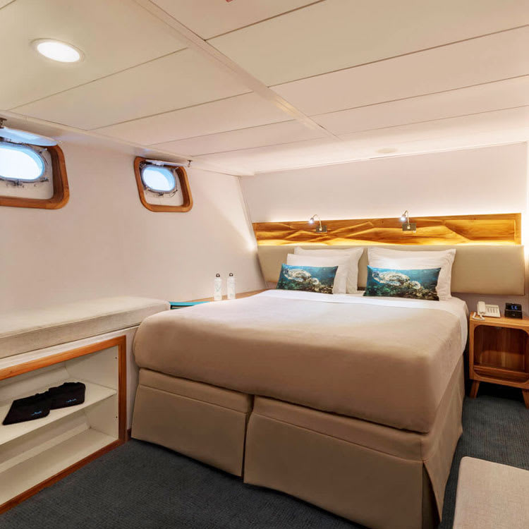 The standard plus cabins are beautifully designed to ensure you get a peaceful night's sleep. It features beds with comfortable linens for comfort, black-out curtains, a closet, LCD TV, and a plastic container under the bed to store snorkeling equipment.