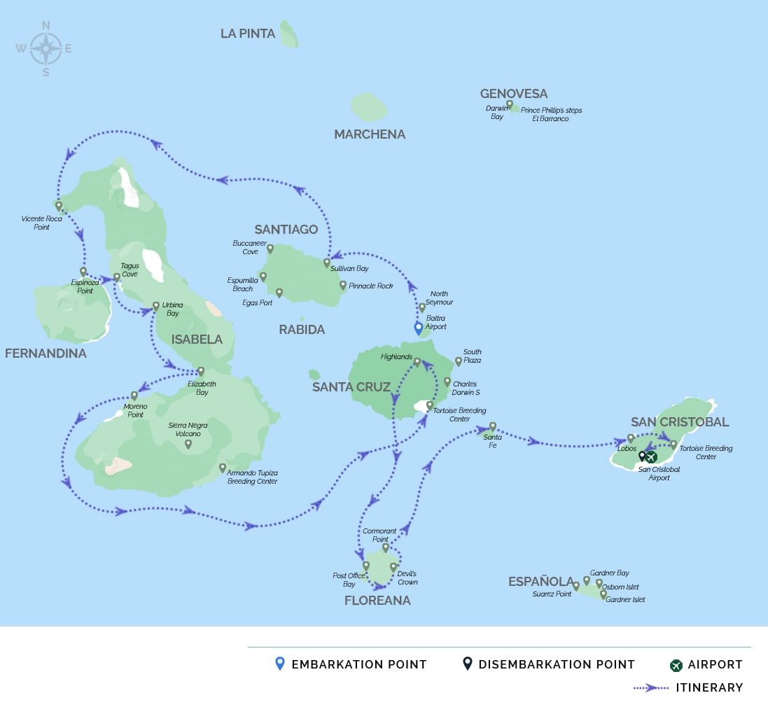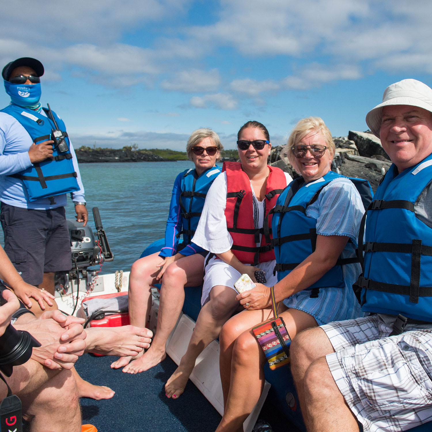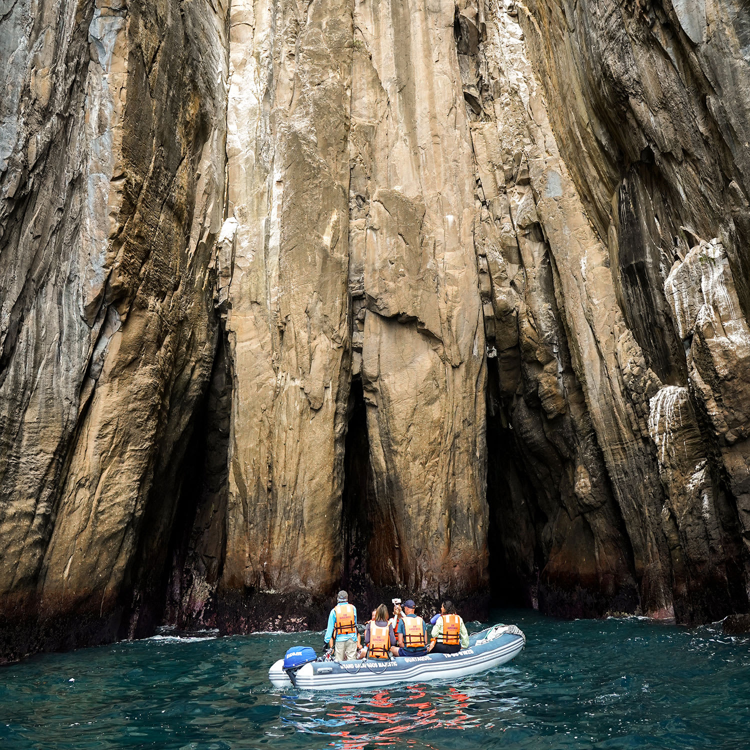 One version features stops on Fernandina and Isabela Islands to see mola-mola sunfish, visit the nesting colony of Flightless Cormorants, hike in a mangrove forest, and look for penguins. The other version of the eight-day route includes stops on Española and Genovesa Islands. During these stops, you will watch sea lions and mockingbirds play and hike to tide pools while watching for red- and blue-footed boobies. No matter which cruise you opt for, every excursion is led by a Galapagos National Park Naturalist Guide.