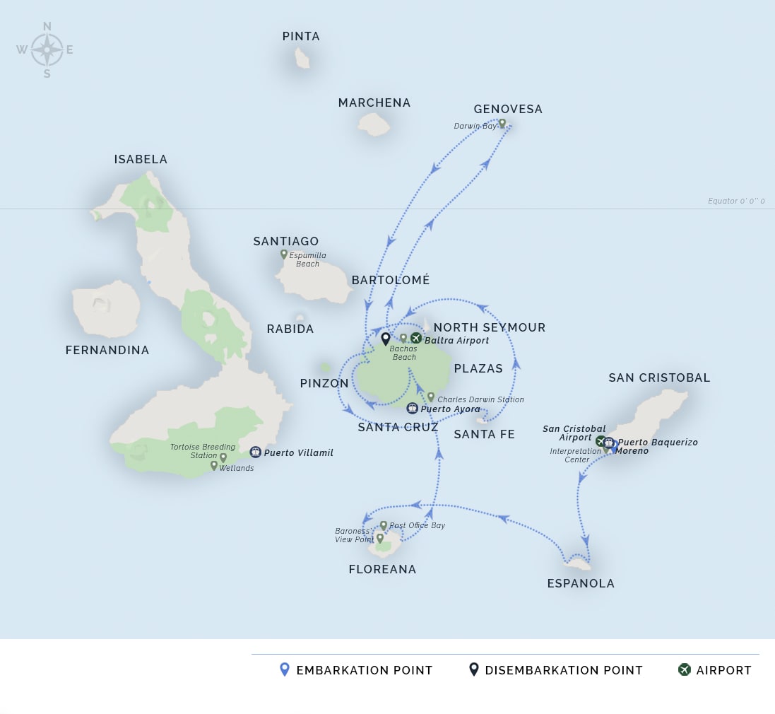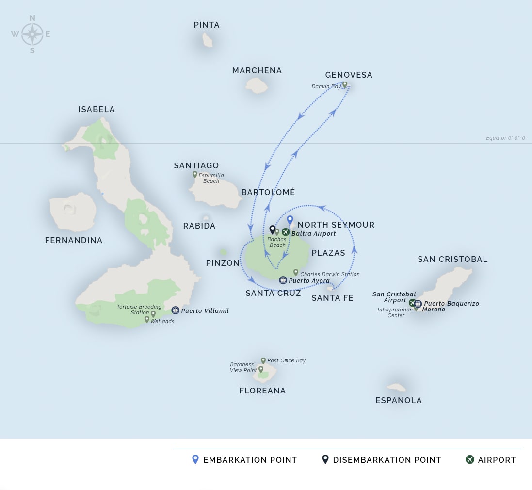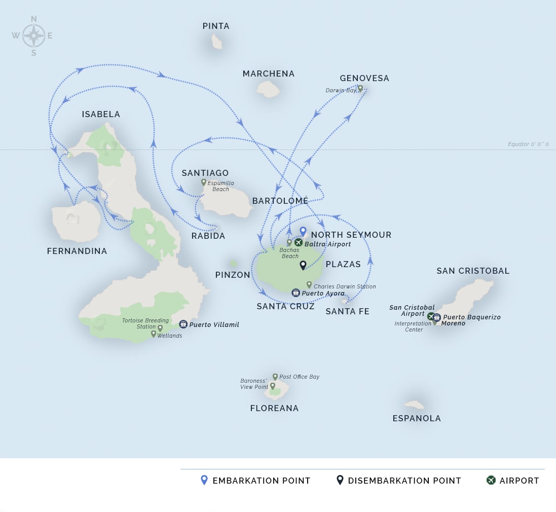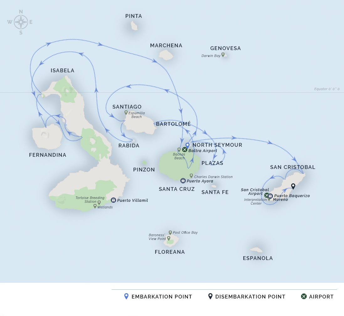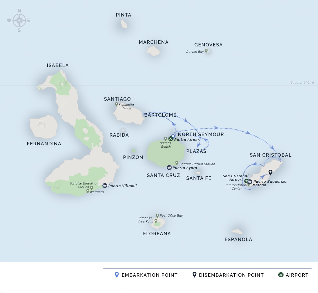 AM: Passengers are picked up at the airport by our naturalist guides and taken on a ten-minute bus drive to the pier to board the M/V Galapagos Legend.
