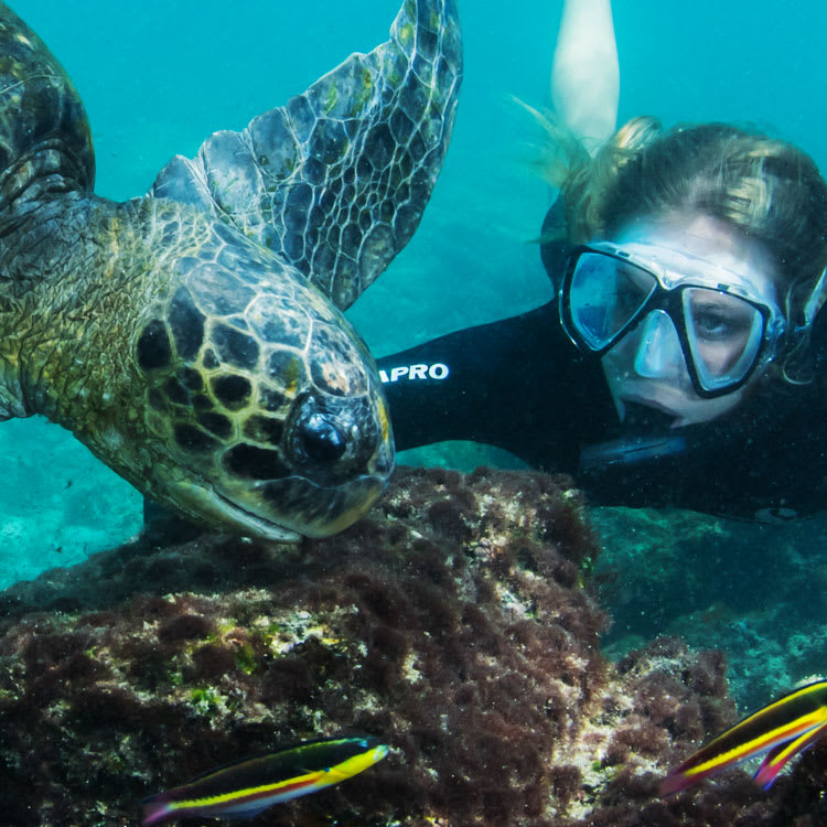 On the north shore of Santa Cruz Island at Black Turtle Cove, four species of mangrove crowd and form an internal lagoon. Turtles visit the calm waters, peaking their heads above the surface, while rays circle below. White-tipped reef sharks can be seen beneath the boat, plus sea birds, including pelicans, herons, and egrets. This cove has been declared as a “turtle sanctuary”.