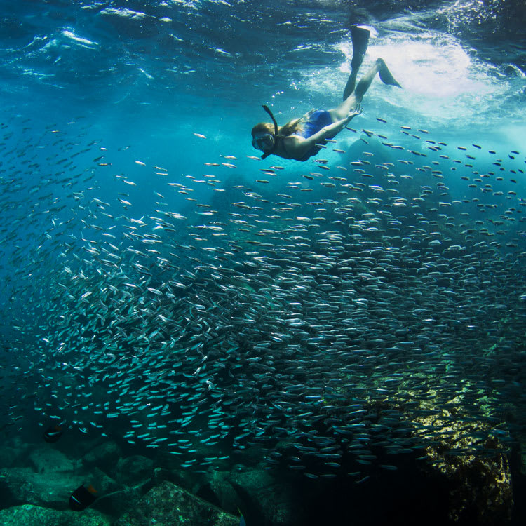 Devil's Crown; one of the favorite snorkeling sites in the islands -an eroded volcanic cone, is home to an abundance of fish and marine animals. We will swim with big schools of yellow-tailed surgeonfish, salemas and creolefish and with luck may spot turtles, spotted eagle rays, parrotfish, and even hammerhead sharks! The jagged crown is a roosting area for boobies noddies, tropicbirds, and frigates.