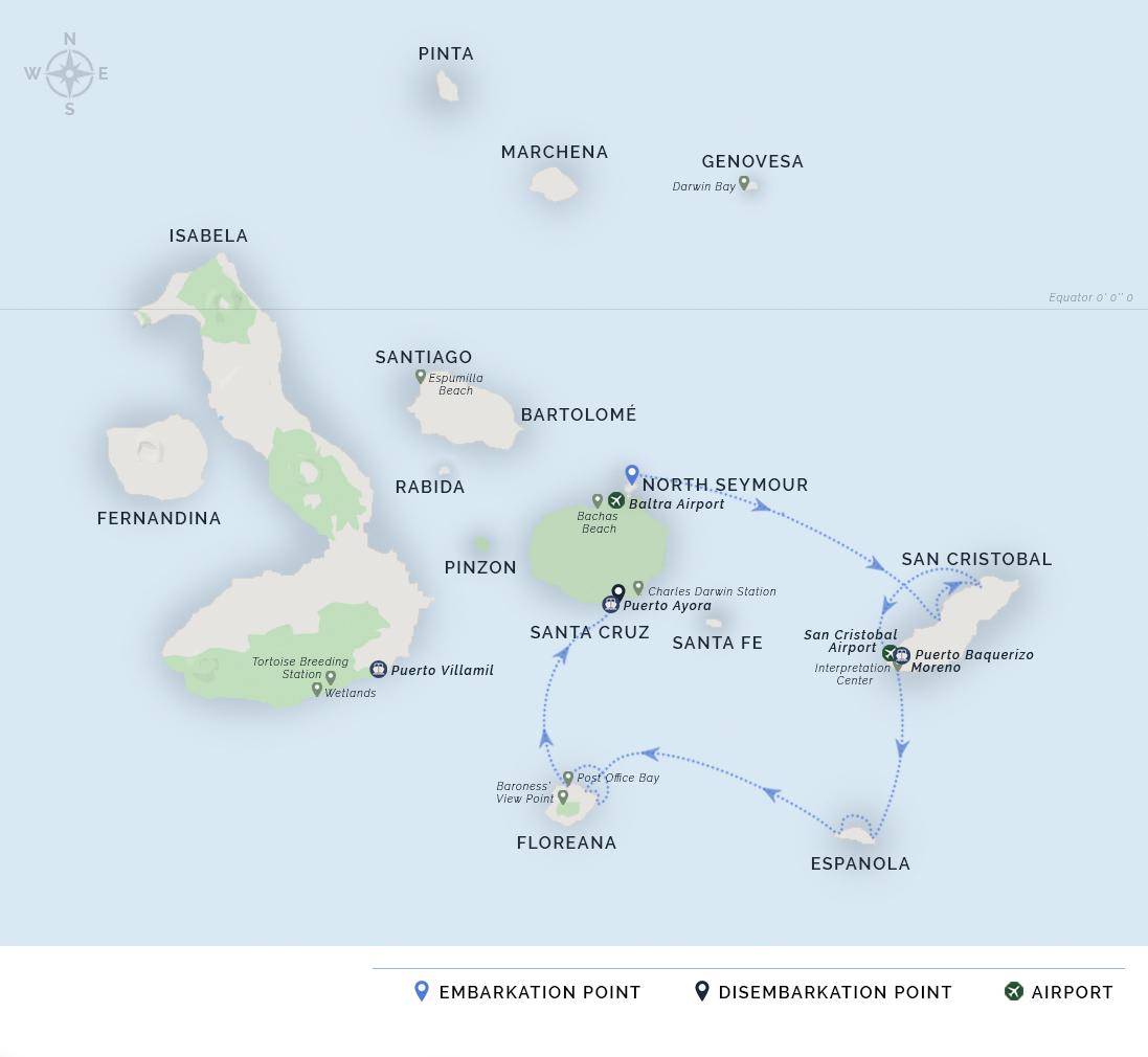 AM: Breakfast service. Among the central islands of the Galapagos Archipelago, Daphne Island sits north of Santa Cruz Island and west of Baltra Island. In reality there are two islands: Daphne Major and Daphne Minor. They are one of the more accessible Galapagos Islands and are easily reached by most tour boats and cruises. Please note that disembarkation on these islands is not possible, therefore we will sail around them for one last look at the beautiful vistas of Galapagos. Check out and airport departure at 8:00.