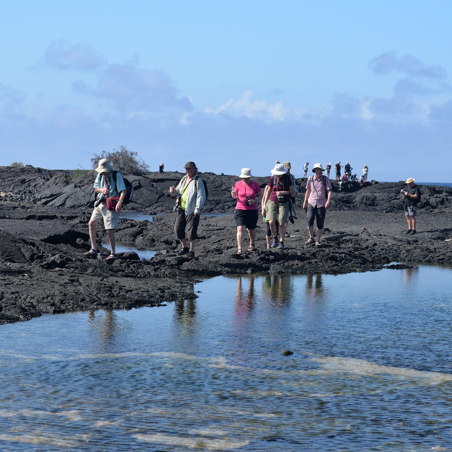 AM: The main attraction of this bay are the broad, Pahoehoe, or rope lava flows. It is one of the most incredible places to compare the lava flows and their characteristics. Panga boat ride to Sullivan Bay. Nature walk. Snorkeling from the beach.