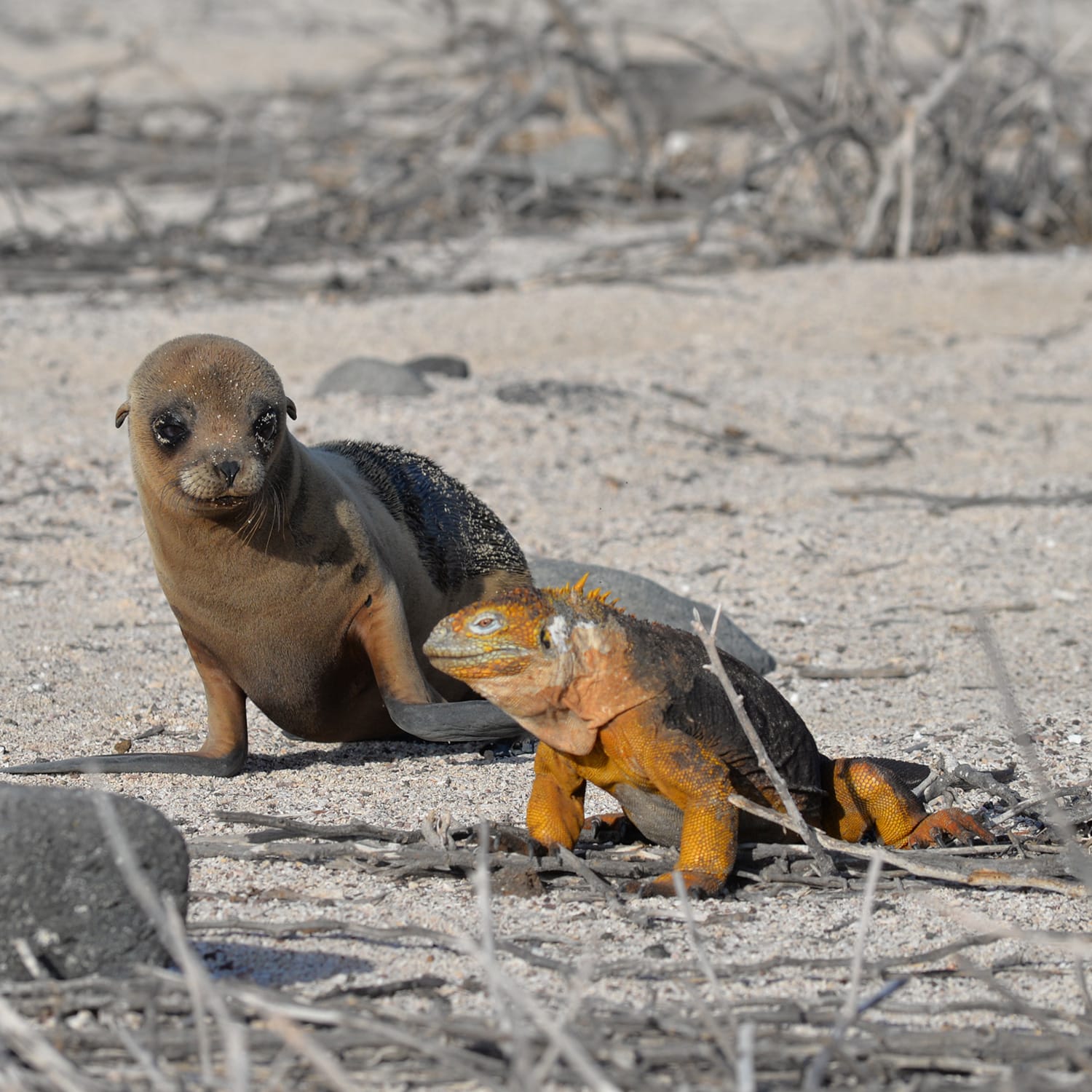 Lying beside Pinnacle Rock are twin half-moon-shaped beaches. The northern beach is a popular snorkeling site where visitors have the opportunity to swim with fish, Sea Lions and Galapagos Penguins. Much larger animals can be found near the southern beach including stingrays, spotted eagle rays, white‐tipped sharks, and black‐tipped sharks. Little vegetation grows in this barren place. Mangroves border the beach and the small shrub Tiguilia grows in the volcanic sands. The seeds and tiny white flowers of the Chamaesycae provide food for the island's finch. These plants are common to arid regions and can survive in these harsh volcanic conditions.