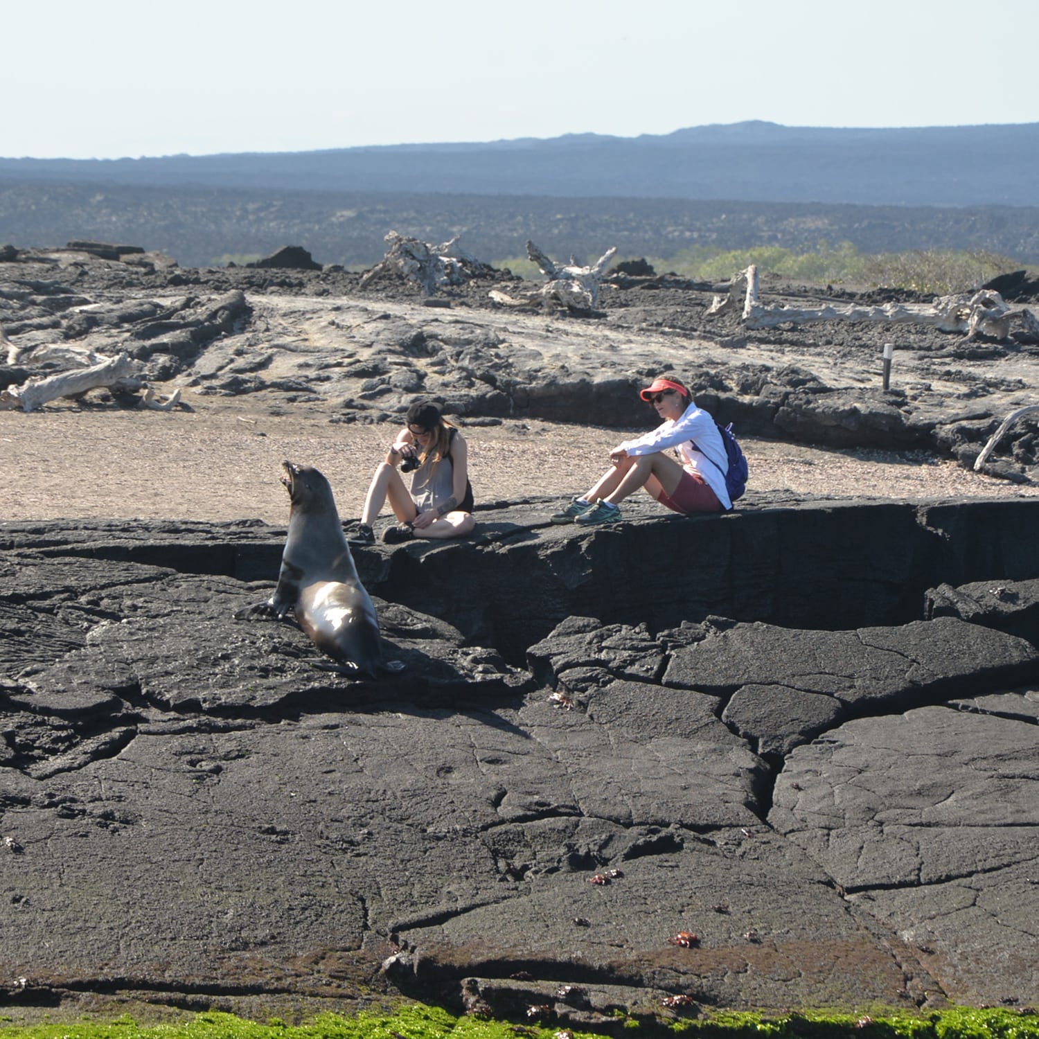 Looking away from the crater are the older orange lava fields supporting vegetation including the Palo Santo trees and the younger desolate black lava fields. The second excursion begins just a short distance beyond the tide pools and heads to the fur seal grotto. Fur seals and sea lions can be seen swimming in the rocky lava-ringed pools. This may be the only opportunity visitors have to see and swim with fur seals.
