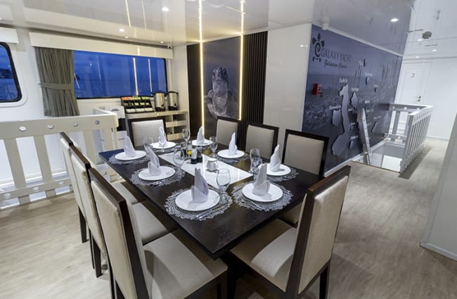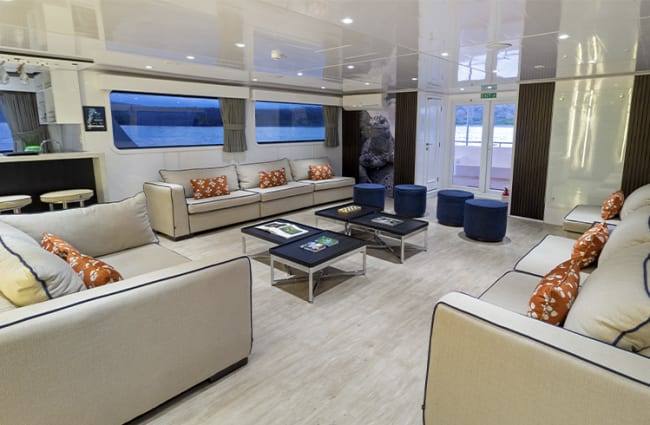 For some fun away from the sun, curl up on a sofa in the living room, play a board game, sign in to the all-new Mydas App for onboard entertainment such as movies, digital books, and educational material on the breathtaking Galapagos Islands. Thanks to a delicious selection of menu and buffet foods, all prepared by an expert chef, mealtimes are a highlight of each day. Local and international cuisine, including vegan and gluten-free options, are sure to delight.