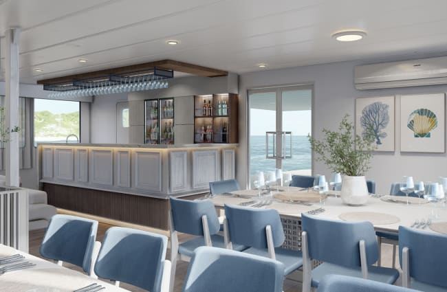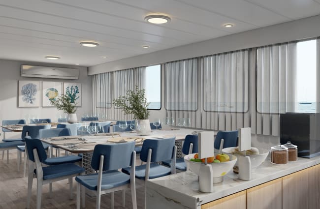 The communal areas, including the dining room, bar, and shaded deck, provide inviting spaces to relax, socialize, or simply take in the breathtaking scenery. The solarium, featuring a Jacuzzi, is the perfect spot to unwind between excursions. The attentive nine-member crew, alongside a naturalist guide or two dive guides, ensures every need is met with warmth and professionalism.