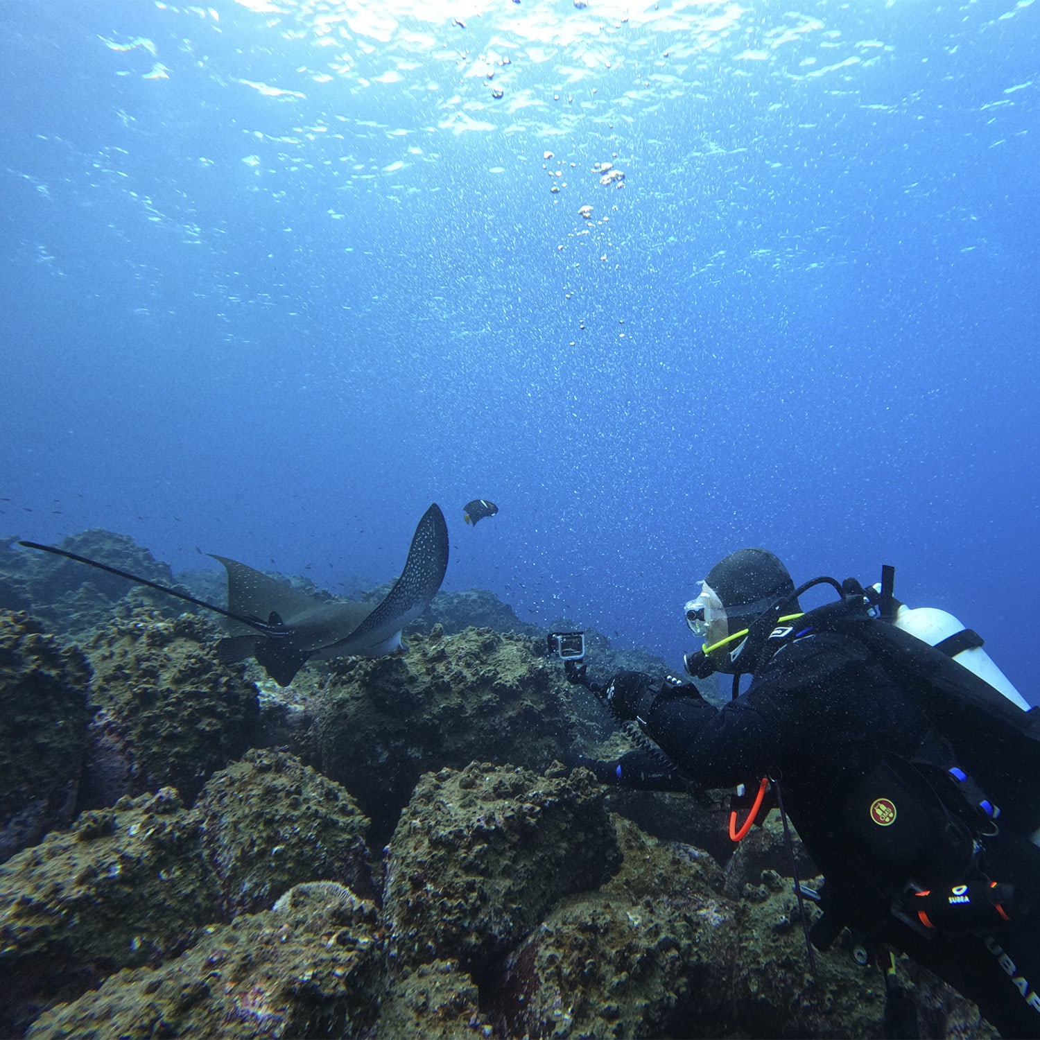 The diving itinerary takes guests to premier dive sites like Darwin’s Arch and Wolf Island, where marine biodiversity is unmatched. Divers can expect encounters with schools of hammerhead sharks, manta rays, and the occasional whale shark, guided by two seasoned dive professionals and equipped with cutting-edge gear.
