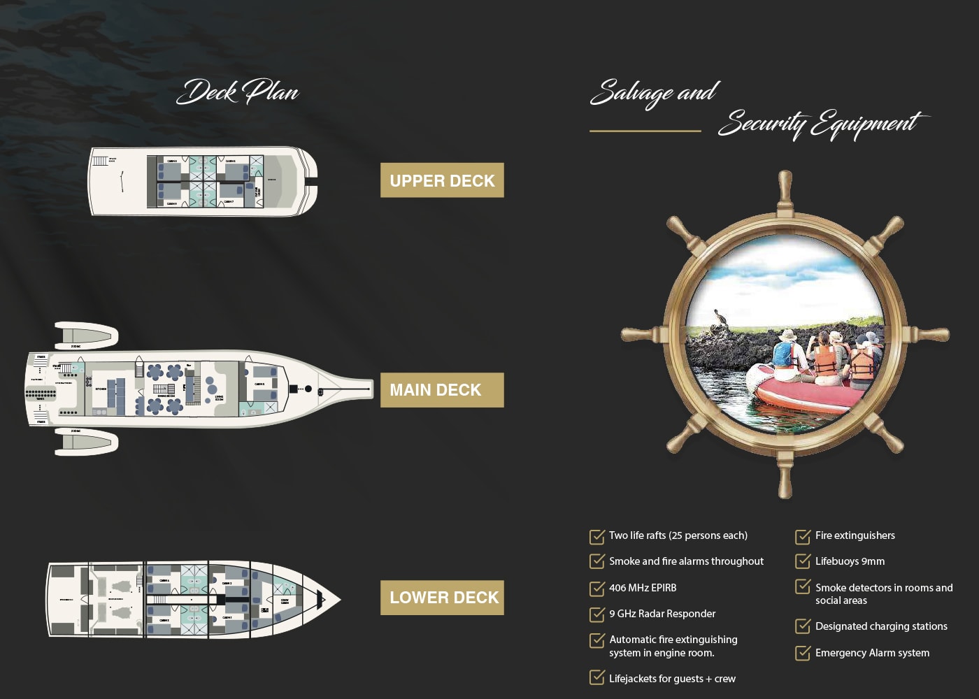 All Standard Cabins are decorated with endemic local style and are equipped with lower beds, functional closets, air conditioning with climate control and reading lights. Cabins 6, 7, 8 and 9 can be triple.