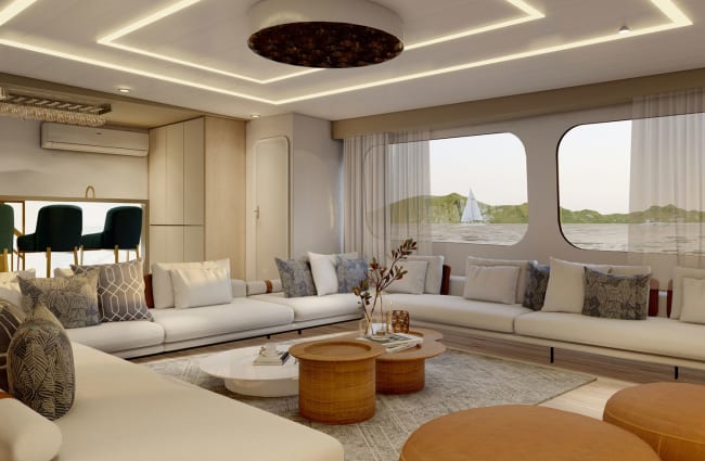The principal deck has four cabins with balconies, an additional cabin without a balcony to the bow, the dining room, a coffee station, the living room, and the bar, plus some cozy outdoor seating to the rear. The upper deck features the bridge, behind which are four more cabins with balconies, and an alfresco area to the rear. Above it, the sun deck is the perfect location to relax and unwind with its wide solarium, Jacuzzi, and lazy chairs.