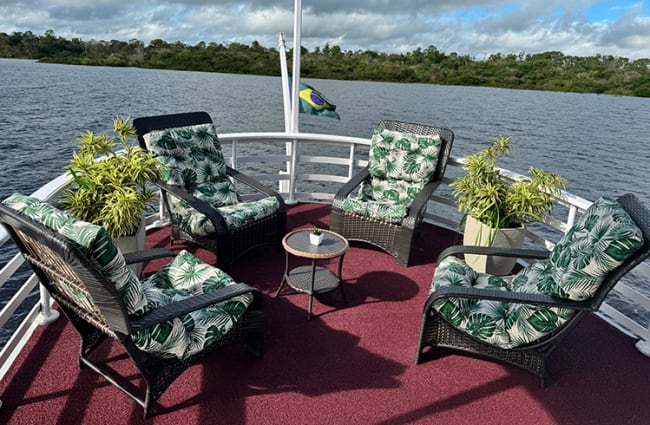 Start your stay with a stop in the lower deck’s bar and kitchen to sip Brazil’s national cocktail. The Caïpirinha is made by muddling cachaça, sugar with fresh limes, and is perfect for toasting the start of your holiday. Then, take your drink to the upper deck’s observation deck to relax in a lounge chair as the boat begins its gentle journey down the Amazon. At the end of the day, retire to your air-conditioned cabin for a restful night’s sleep.