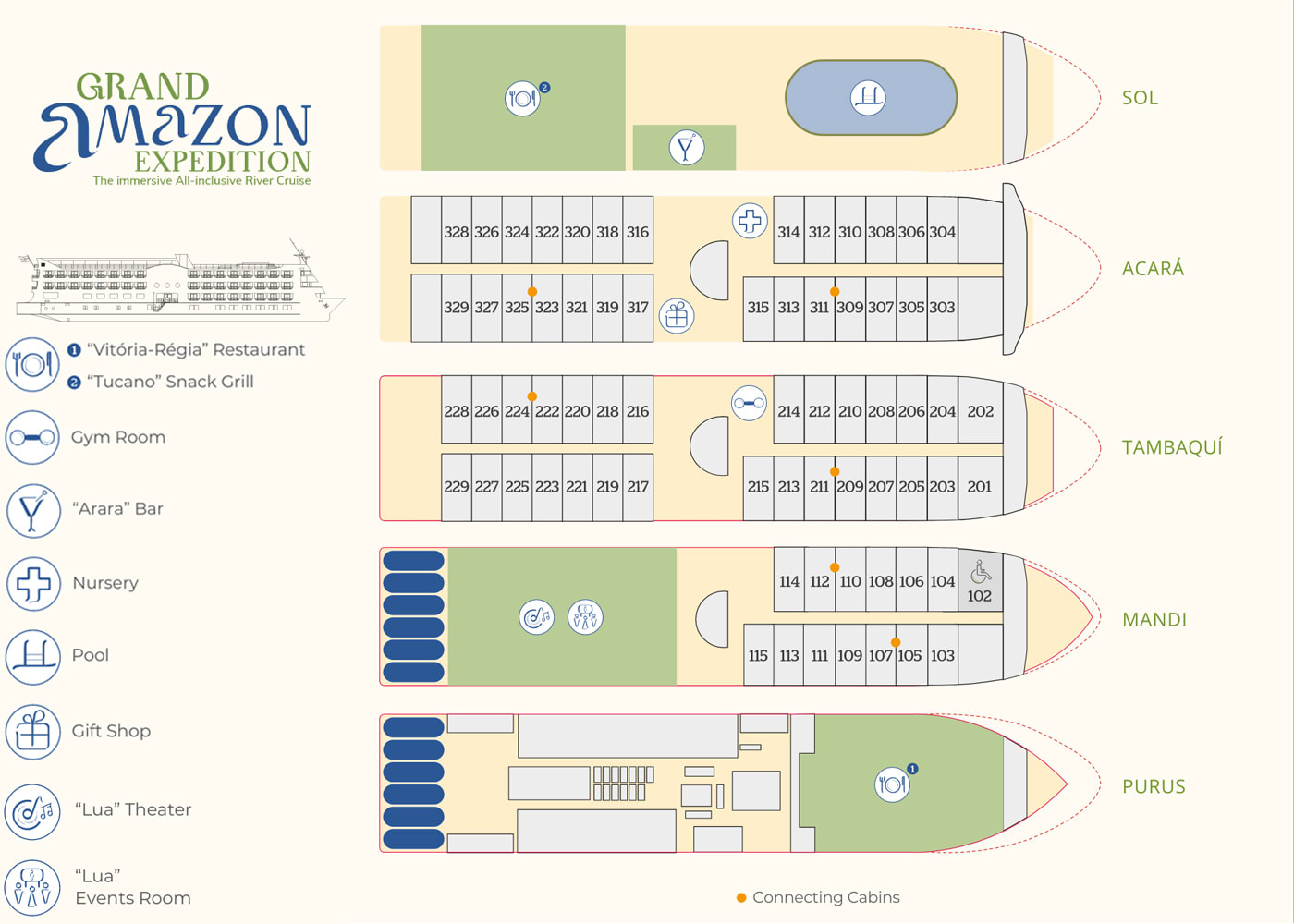 There are also two pairs of interconnected cabins on each floor, which allow plenty of space for families to play and sleep comfortably. A wheelchair-accessible room is also available, and an elevator provides access to each level, making the Iberostar Grand Amazon Expedition a unique option for people of all abilities.