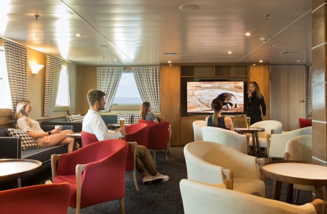 Welcome to your home in the Galapagos. What will you do while aboard? The choices are nearly endless, thanks to a large number of spacious decks and public spaces. Start at the alfresco lounge to catch your first glimpses of the birds and sea life of the Galapagos as the ship casts off. This is the perfect time to pick up a cold drink at the outdoor bar and toast to the one-in-a-lifetime experiences that will come in the days ahead. Then, relax in the hot tub while you work up an appetite for the evening meal.