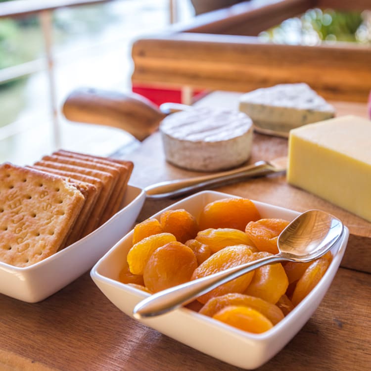 The river level cabins of the Main Deck have been delightfully finished in teak and brass, and feature panoramic French windows and an ensuite bathroom with spa-branded amenities and hairdryer. Inviting beds with premium mattresses and linens are convertible between twin and double as desired.