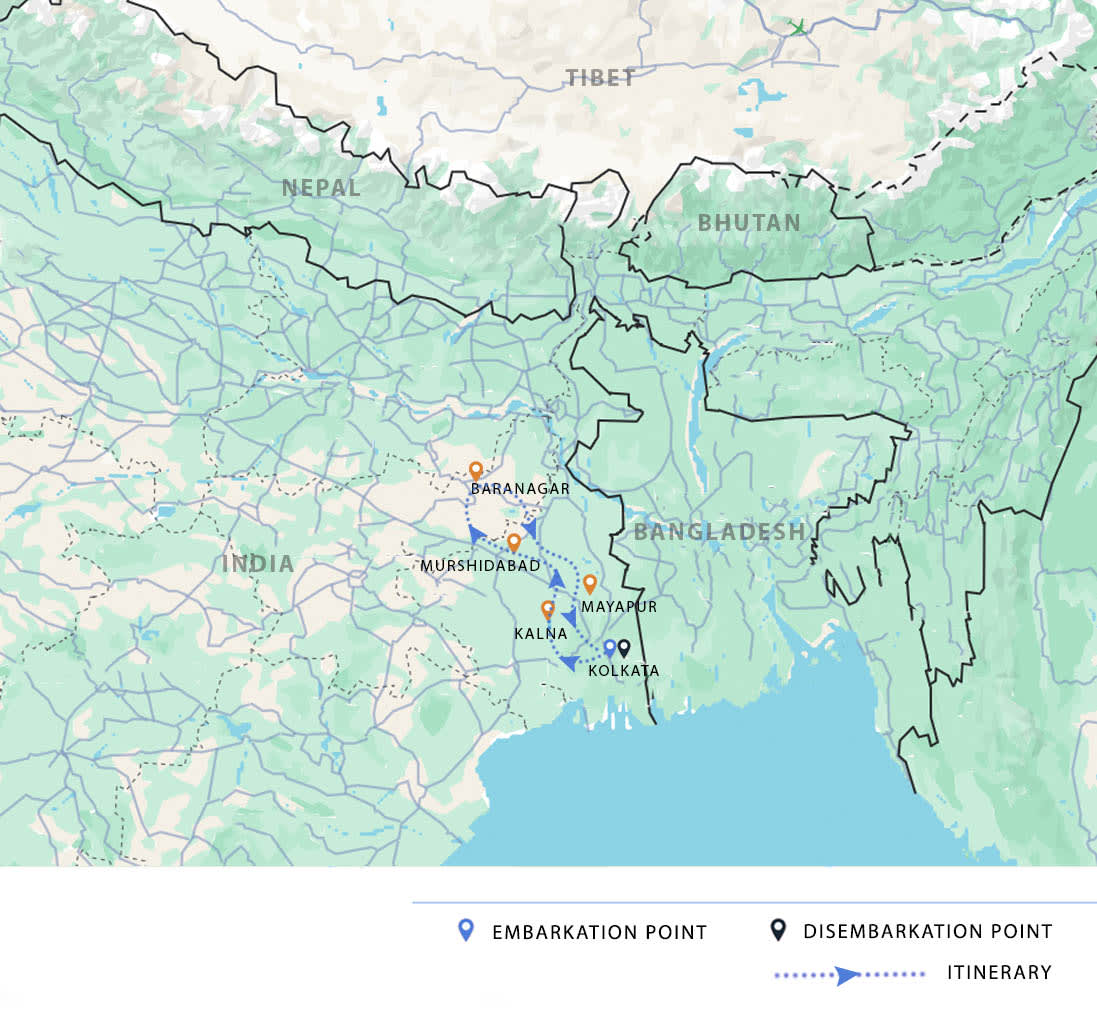 AM & PM: Continue sailing downstream before landing to visit the imposing Imambara at Hooghly. With verses from the Quran written on its walls, the Imambara is an opportunity to step back in time and relive a slice of Islamic history in Bengal. Sail past the old Dutch settlement of Chinsura to Chandernagore, a French possession until 1950. Visit the 18th-century church and Dupleix's House, erstwhile Governor-General of French India. Enjoy a TukTuk ride to the Hangseshwari Temple before sailing into the night to a mooring near Kolkata.