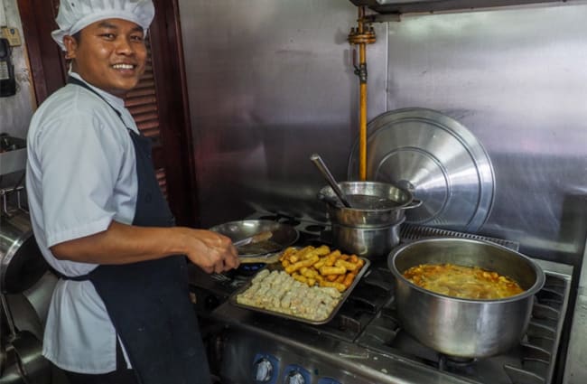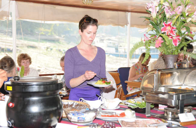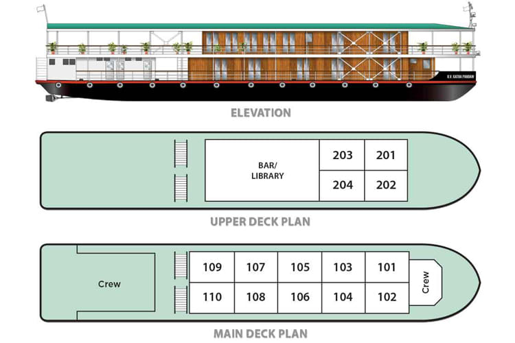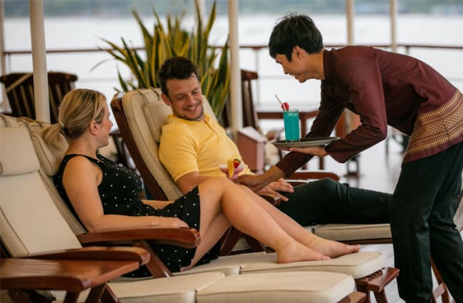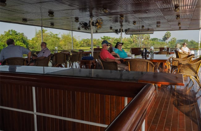 Passengers are able to spend leisure time on the aft part of the covered Upper Deck where they can take in the sights from teak loungers and wicker furniture whilst enjoying a drink from the bar, or in the cozy comforts of the new lounge where complimentary soft drinks are served, guide briefings held, and evening cultural performances, educational talks, and cooking classes take place. An open-bridge policy allows access to the wheelhouse for those inquisitive about the boat’s navigation, and there is also a small on board shop selling fair trade products.