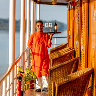 Meals are prepared by a local master chef who heads an experienced international culinary team, using fresh, locally sourced ingredients, and served bistro-style both indoor and outdoor on the Upper Deck. Breakfast and lunch are buffet-style, with sit-down multi-course, themed dinners. Combined with the complimentary evening canapés and daily freshly baked breads from the onboard bakery, the cuisine on board your cruise—in conjunction with the exciting and authentic excursions—really does encompass the Indian lifestyle completely.