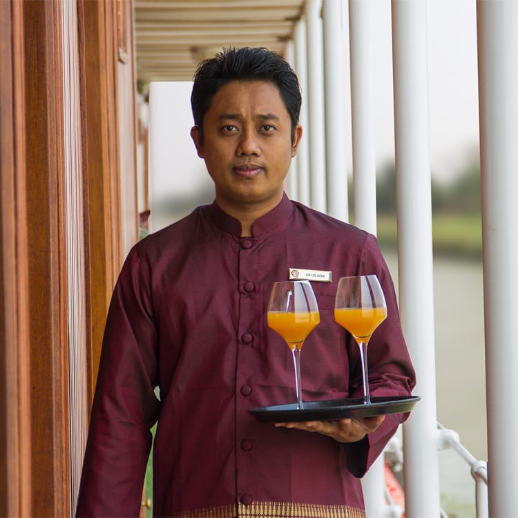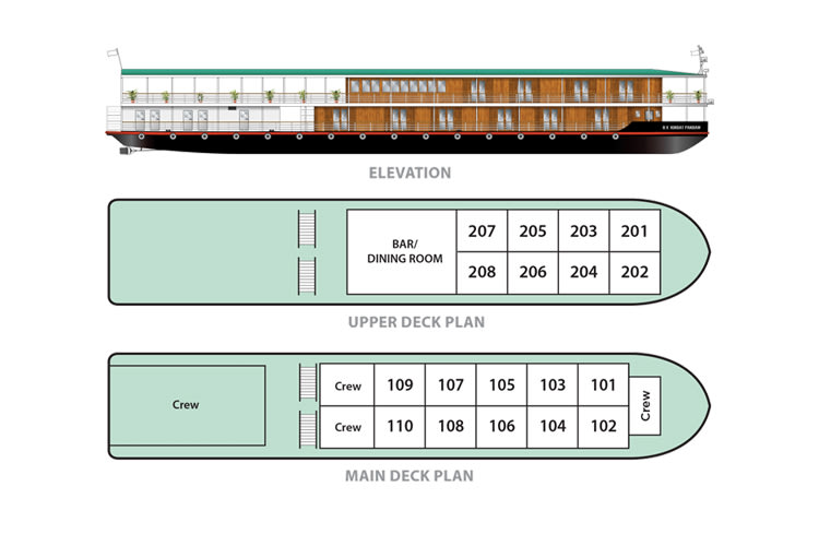 Following experiments with its older sister ships, the Katha and Angkor Pandaws, and by reducing weight and stripping both hull and superstructure down to the bare essentials, the construction of the Kindat Pandaw perfected the concept of a two-deck ship with a very shallow draft. This iterative and innovative design affords her 36 passengers (at maximum capacity) all the comforts of the extra social areas and space two decks provide, plus the added benefit of the vessel’s shallower draft enabling deeper navigation into the river’s narrow channels and tributaries for a more intrepid experience.