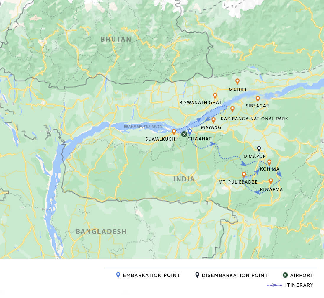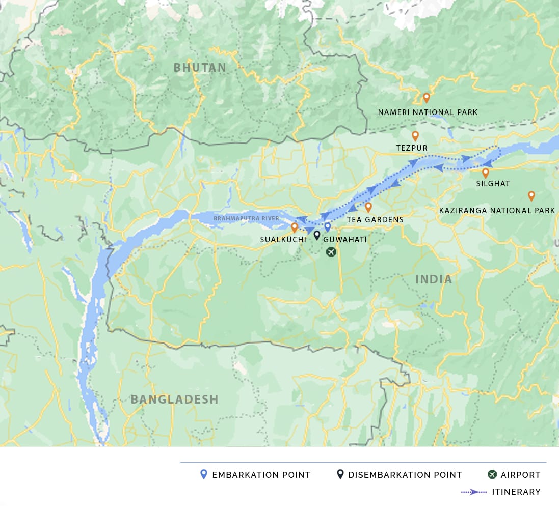 AM: Disembark after breakfast and transfer to your hotel or Guwahati airport (15km / 30 min). Transfers can be arranged as per your flight details with the latest departure from the ship at 11am.