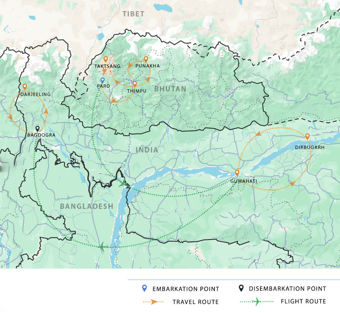 AM & PM: Dock at Guwahati. Following breakfast transfer privately for your flight to Bagdaogra. Receive a warm Pandaw welcome on arrival into Bagdogra Airport, and journey by road to your accommodation. Spend the rest of the day easing into your magical surroundings or step outside and stroll the main square and mingle with Nepalese, Bhutanese, Tibetan people and domestic Indian tourists.