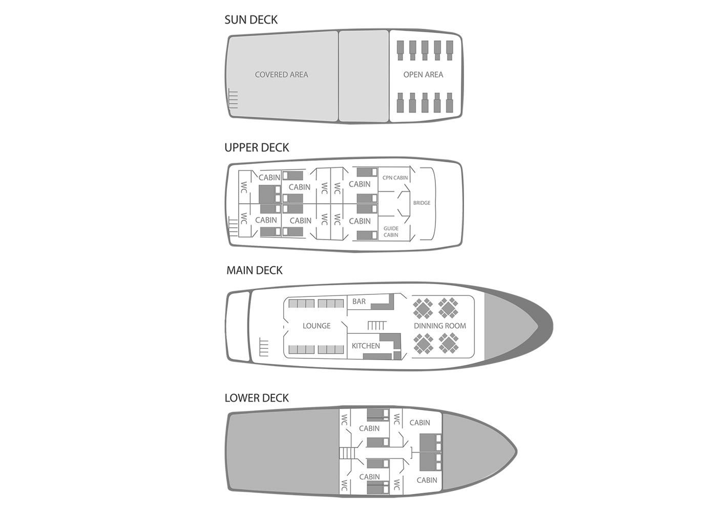 This deck also plays host to the ship’s bar, and a comfortable dining room. Here you will enjoy a wide range of delicious local and international dishes, from your substantial breakfasts, to the mouthwatering warm lunches and dinners, all served in an abundant buffet style and freshly prepared by the professional chef.