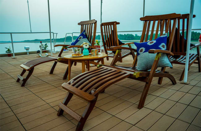 MV Bhitarkanika boasts just two spacious suites designed to host up to four guests in supreme comfort, ensuring a restful night’s sleep in the heart of the forest. Contemporary furnishings, original artworks on palm leaves, handloom textiles, and luxury linens create a tranquil haven. From honeycomb spa robes and slippers to spa-quality bath amenities, every detail is designed for indulgence.