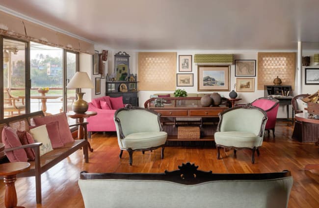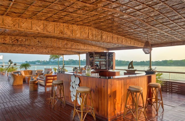 Her décor reflects colonial elegance brought to life with traditional Indian designs, offering a warm and refined ambiance. All cabins are spacious, climate-controlled, and feature large sliding glass windows and French balconies, ensuring panoramic views of the river are a constant companion to your journey. Guests can relax in the comfortable, air-conditioned saloon, find a quiet moment in the library, or ascend to the vast canopied sundeck to feel the river breeze.