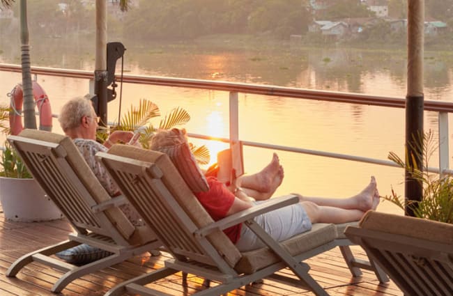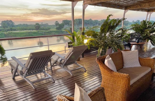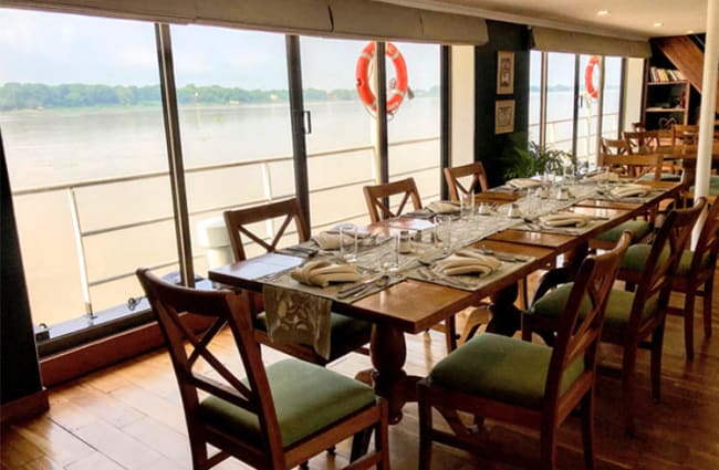 Like all accommodations, these cabins are equipped with individual climate control, generous storage space, and feature elegant touches like hand-blocked cotton fabrics and a private French balcony. You can enjoy serene, low-level views of life on the river and bank while relaxing amidst the cabin's colonial charm.
