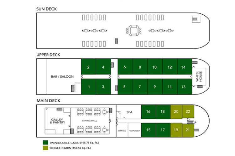 Designed with the same refined style as their counterparts, the four Main Deck Cabins offer an intimate and tranquil retreat close to the ship's central activities. These comfortable twin or double accommodations are conveniently located near the dining room, perfect for those who prioritize easy access to the ship's acclaimed Assamese and Continental cuisine.