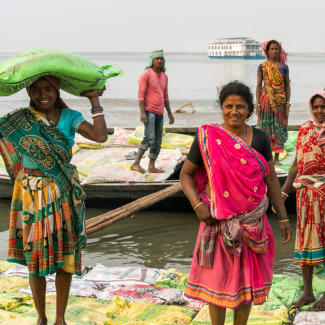 PM: Reboard and continue past the confluence with the River Sone to the busy river port of Doriganj, mooring at an overnight stop near the confluence with the River Goghra.