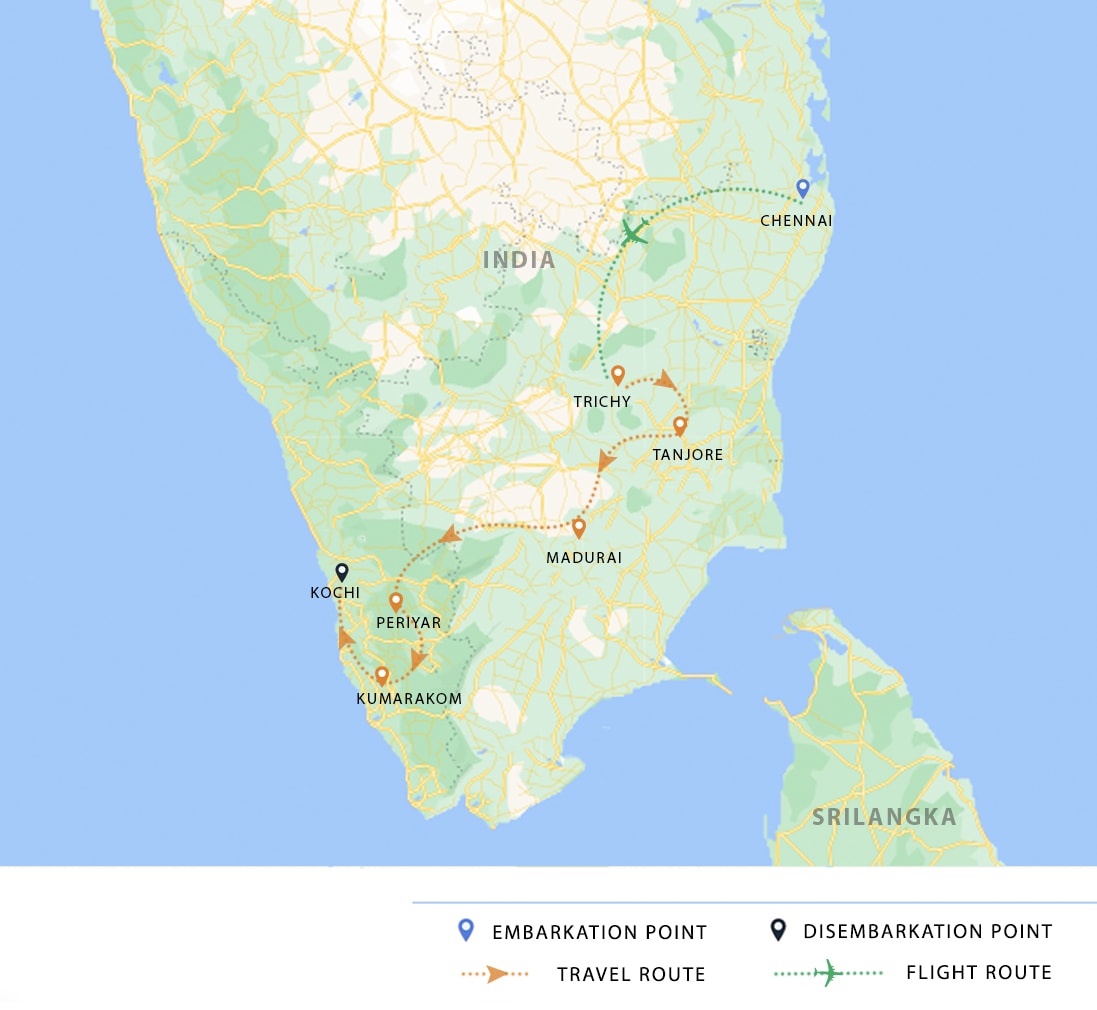 Starting with three nights in the city of Chennai, formerly known as Madras, explore the nearby temple town of Kanchipuram, and the coastal town and rock temples of Mahabalipuram. Fly to Trichy and follow the overland temple trail through the South Indian state of Tamil Nadu, the home of the Tamil people. Continue to the state of Kerala with a stopover to observe the elephants and wildlife of the Periyar National Park, followed by a day-cruise through the backwaters that lace through Kumarakom, before ending with two nights in Kochi. All tours and excursions are on a private basis, by means of private transportation, and accompanied by an expert private guide.