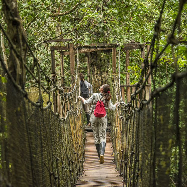 The Zafiro travels with three auxiliary boats, two of which hold up to 25 passengers and the other of which has a capacity of 15. These support crafts take small groups on river explorations and ashore for land-based activities. During the four-day cruise, learn to catch piranha using local techniques on the Dorado River and visit the Huaysi community to learn about local traditions. During the five-day route, take a walk through the rainforest overhanging bridges, visit a local Shaman and help plant a tree in the rainforest.