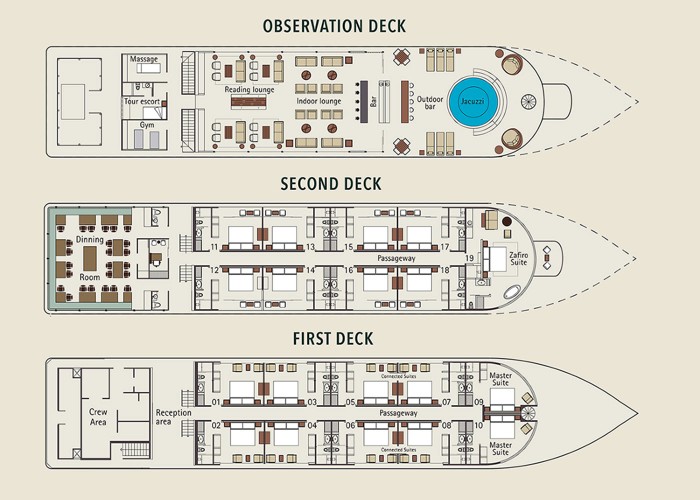 Spacious and elegant, with wall windows for privileged views, the lower deck suites are abound with amenities. From their orthopedic beds and safety deposit boxes, to their refreshing drink-stocked minifridges and writing desks from which to jot down your Amazon diary, your stay is sure to be relaxing and comfortable. Suites 5 & 7 and 6 & 8 are interconnecting and up to 4 guests, making them convenient for close friends or family members.