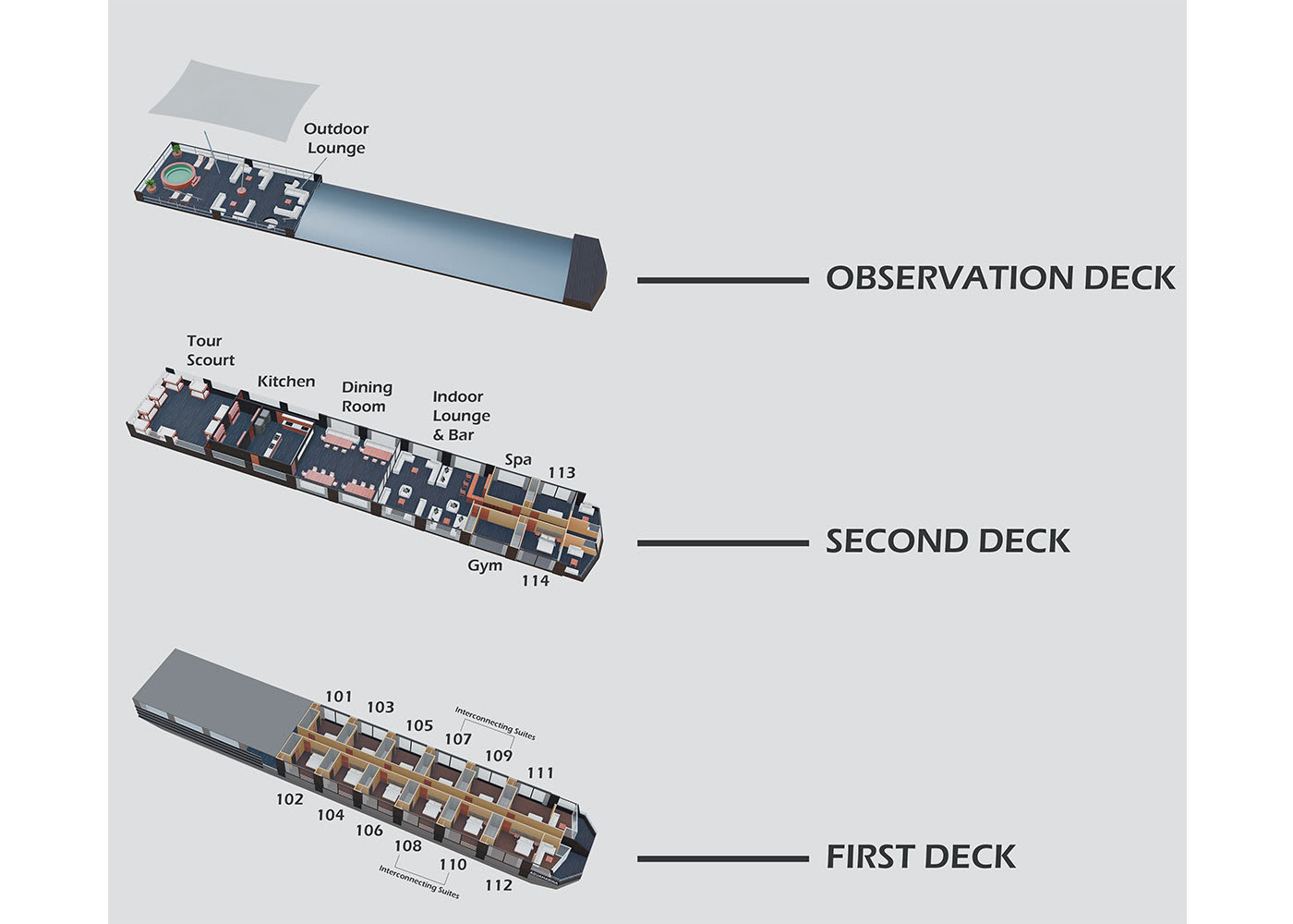 The Master suites are elegant cabins with a floor-to-ceiling window allowing plenty of natural light. They are also spacious with extra indoor space. The gorgeous bathrooms are equipped with hot-water showers to refresh after a day of exploring the Amazon. An additional bed can be added on request for triple occupancy.