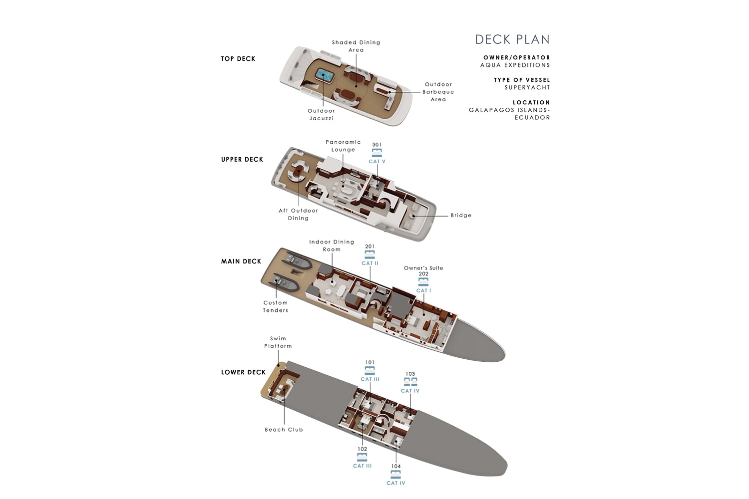 The seven-suite Aqua Mare is the first superyacht to sail in the Galapagos Islands. At 164 feet long, the four-deck-high ship presents indoor and outdoor social spaces, stylish finishing, and absolute attention to detail, making her the ultimate luxurious retreat while exploring the volcanic landscapes of the Galapagos Archipelago.